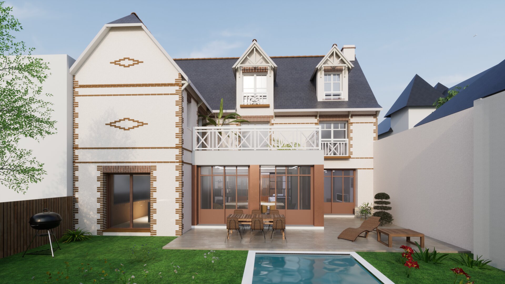 Le parti architectural consiste à concevoir une maison alliant tradition et style balnéaire, en harmonie avec le contexte environnant. L’aspect traditionnel se manifeste par la mise en place d’une toiture à deux versants avec coyaux, couverte en ardoise naturelle, ainsi que par des lucarnes jacobines à double pente habillées de clairs ardoises. Le style balnéaire, quant à lui, s’exprime à travers des modénatures soignées, des éléments de charpenterie apparents et des débords de toit marqués.